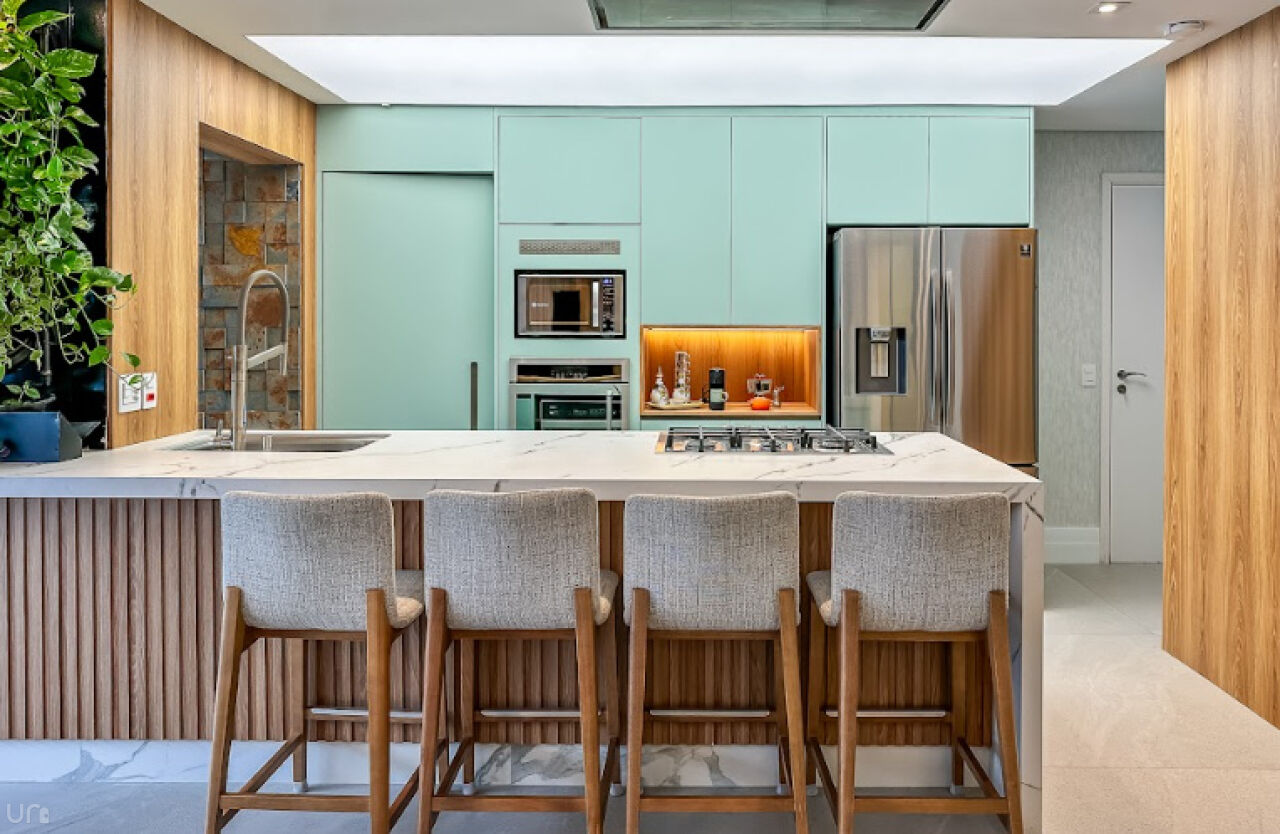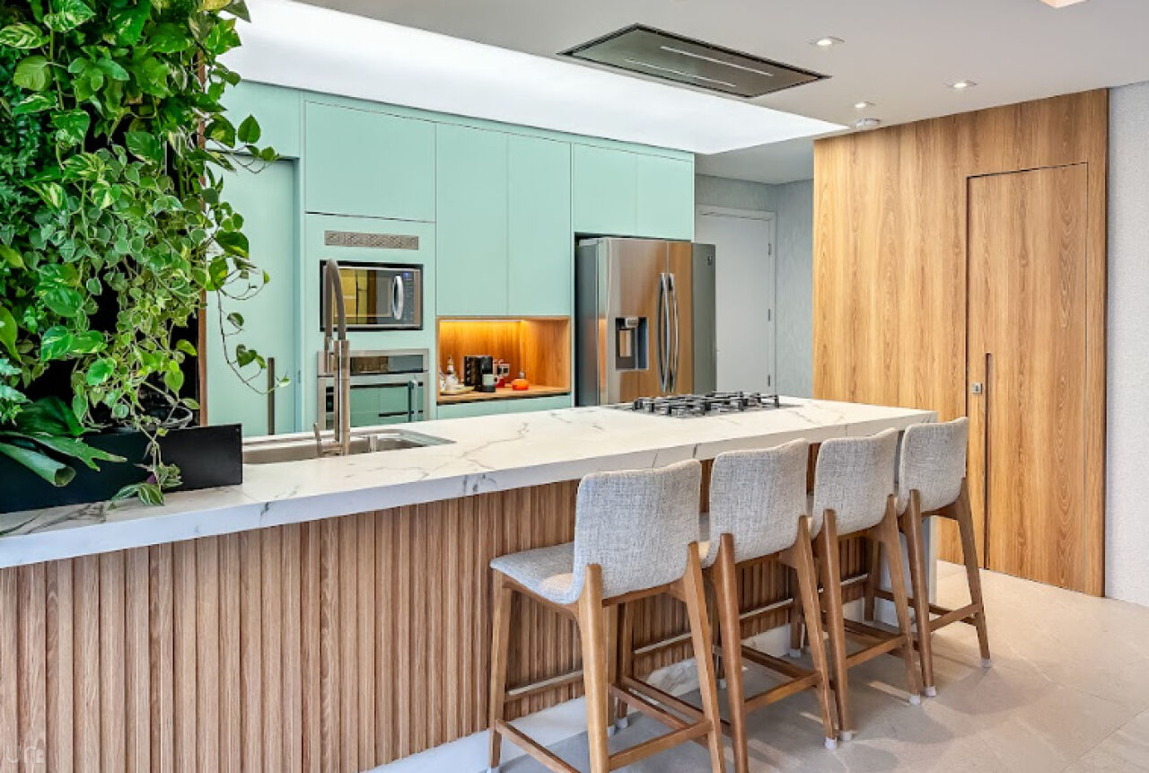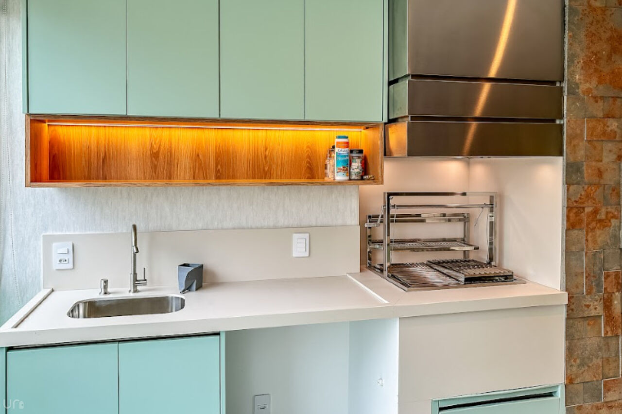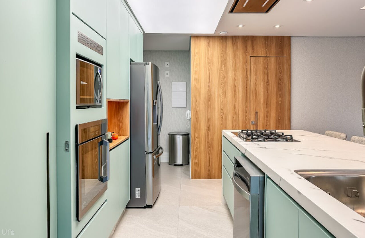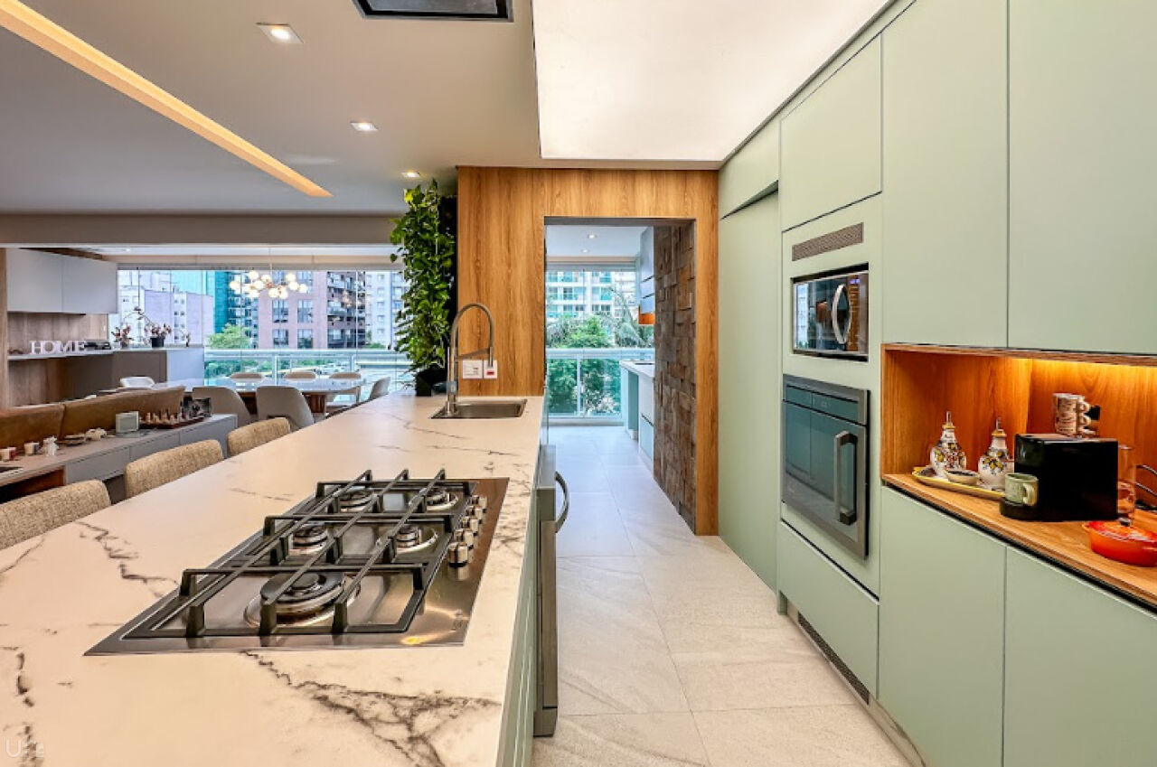 Equipada com eletrodomésticos Samsung e Electrolux e também um cooktop 5 bocas e coifa italiana Crissair, embutida no teto. A bancada é em pedra importada Deckton, não mancha, não risca e suporta temperaturas extremas. A iluminação em tensoFlex proporciona uma sensação de luz natural, cobrindo todo o teto da cozinha.