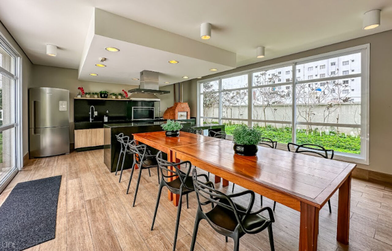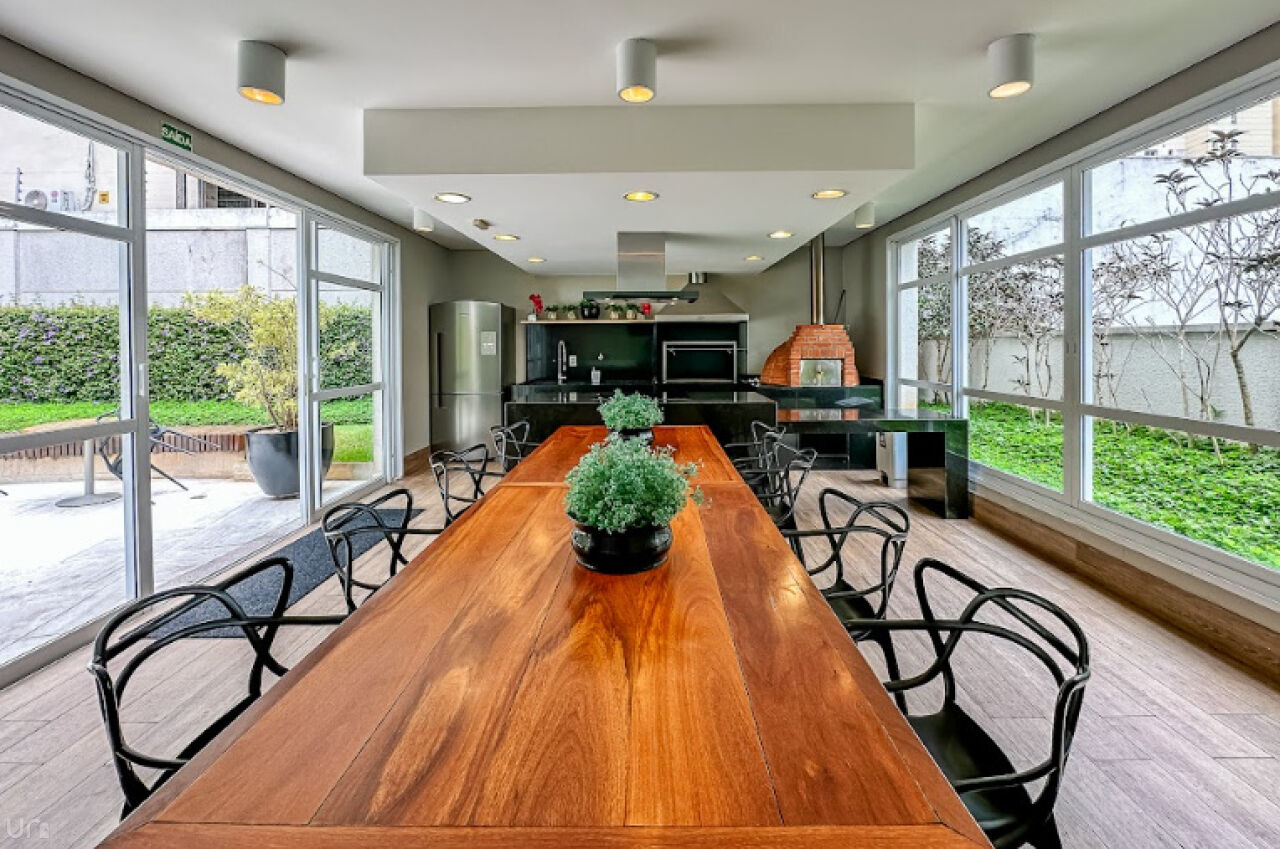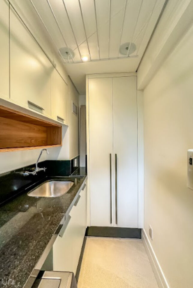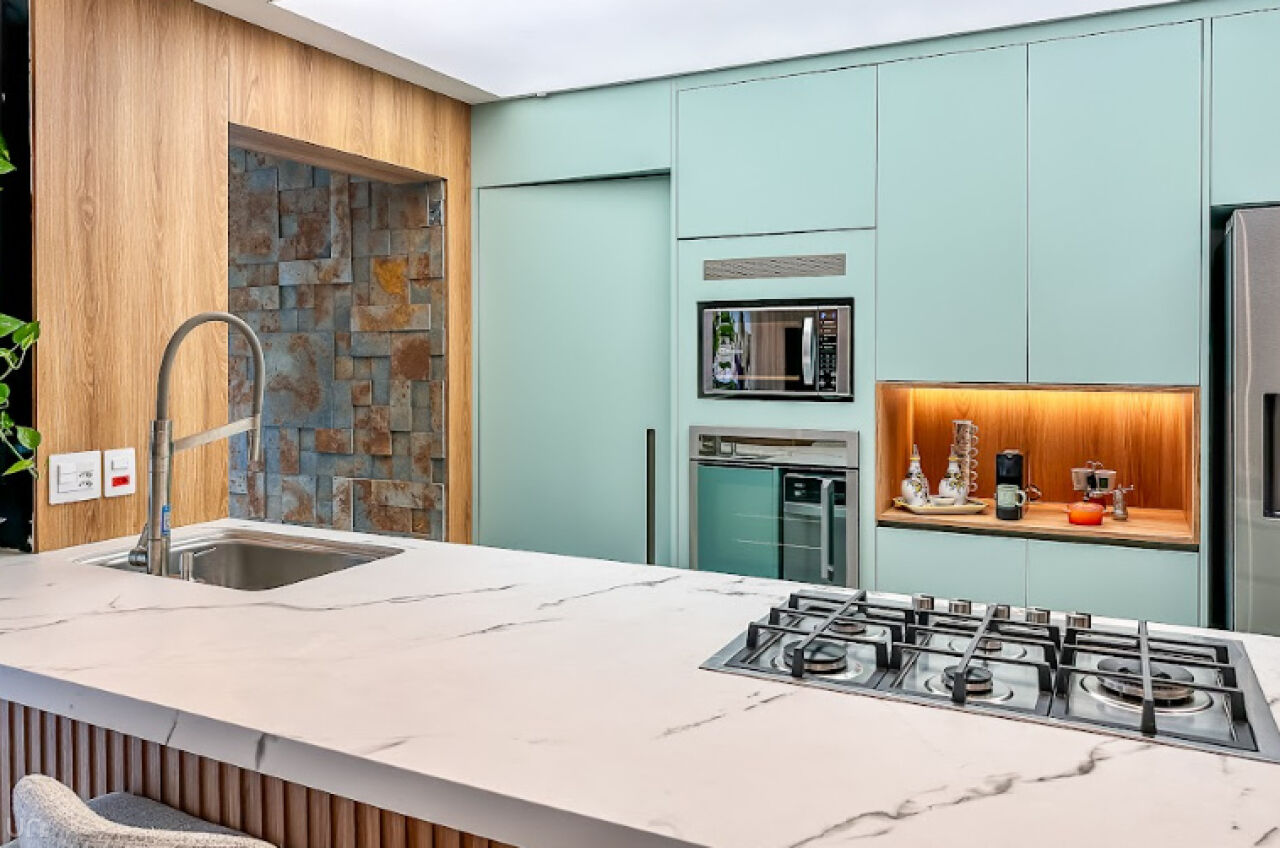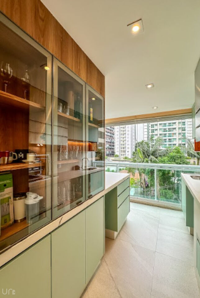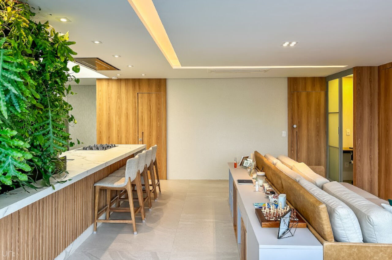 Equipada com eletrodomésticos Samsung e Electrolux e também um cooktop 5 bocas e coifa italiana Crissair, embutida no teto. A bancada é em pedra importada Deckton, não mancha, não risca e suporta temperaturas extremas. A iluminação em tensoFlex proporciona uma sensação de luz natural, cobrindo todo o teto da cozinha.