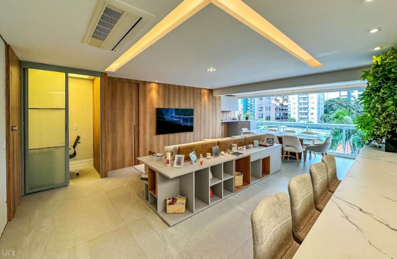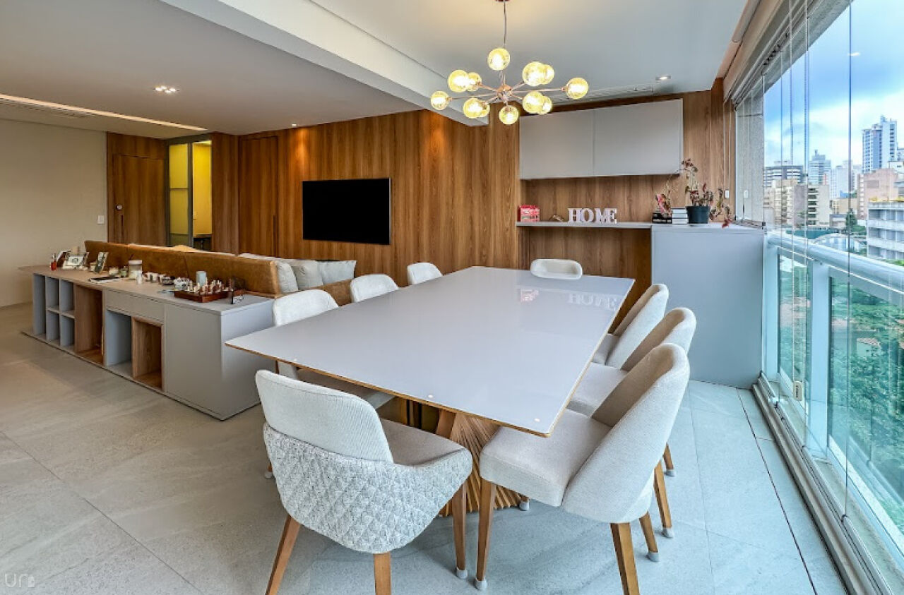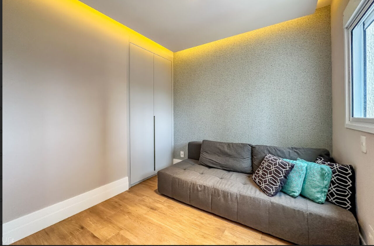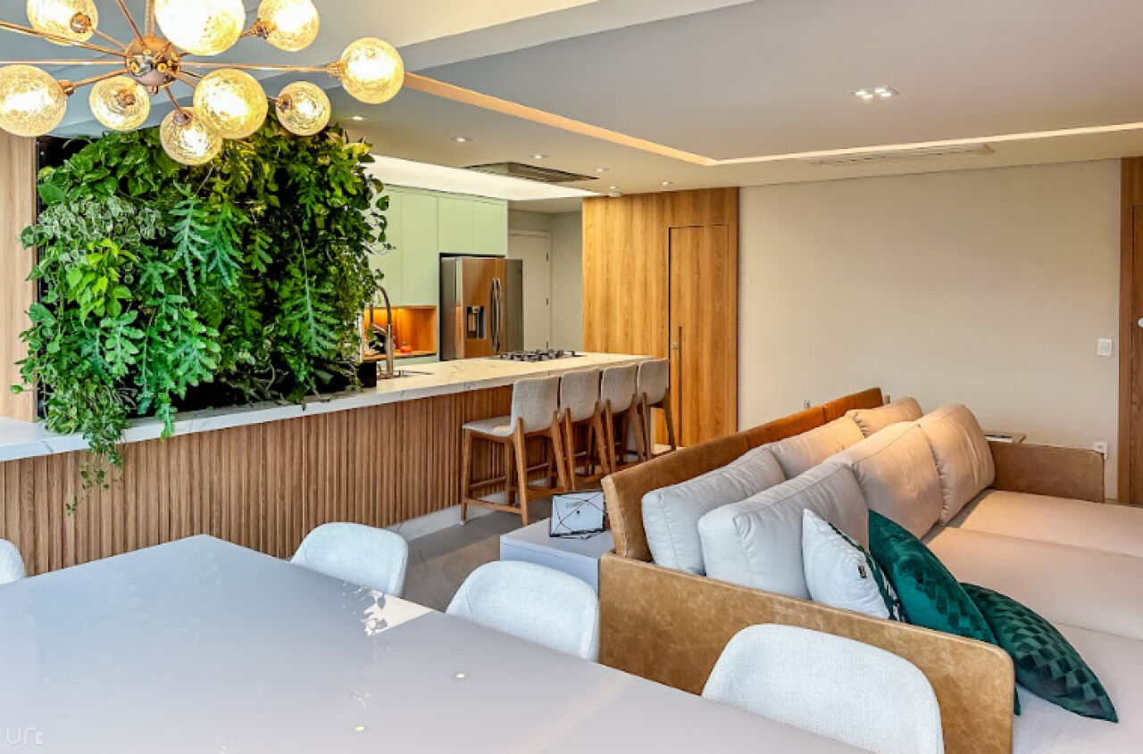 O apartamento é novo, n, recém terminado, possui 106 metros quadrados, duas suítes, duas vagas, um lavabo, um escritório, uma sala estendida em conceito aberto e 100% projetado pela arquiteta. Destaque para a iluminação automatizada da Philips Hue, oferecendo até 1.000 opções de cores, casa inteligente, com dimerização, controle pelo celular e assistentes virtuais.