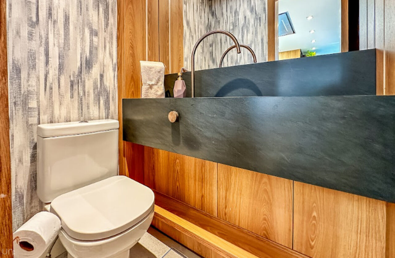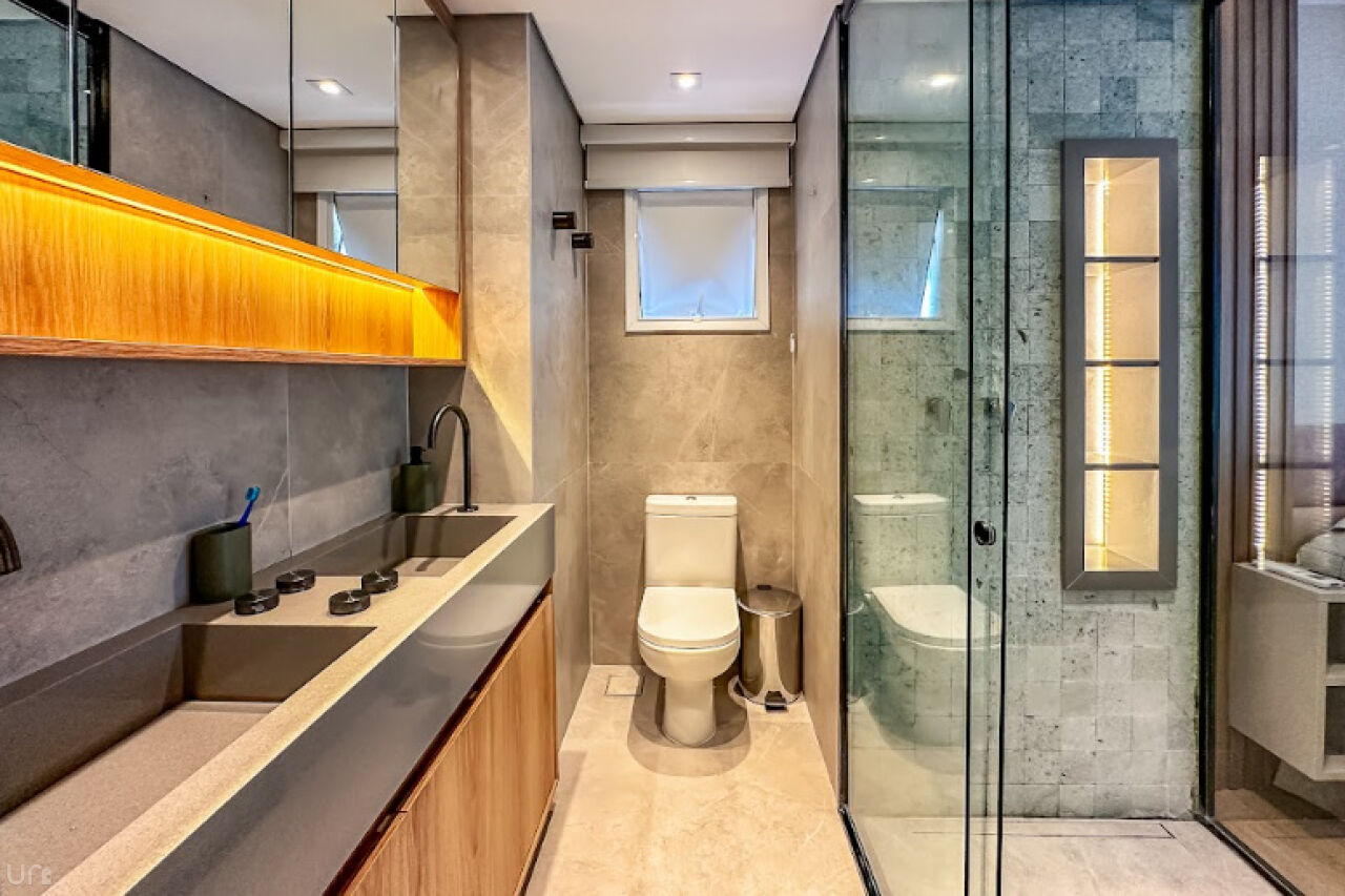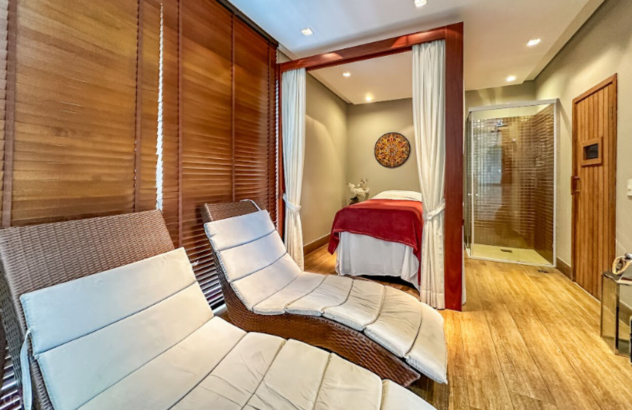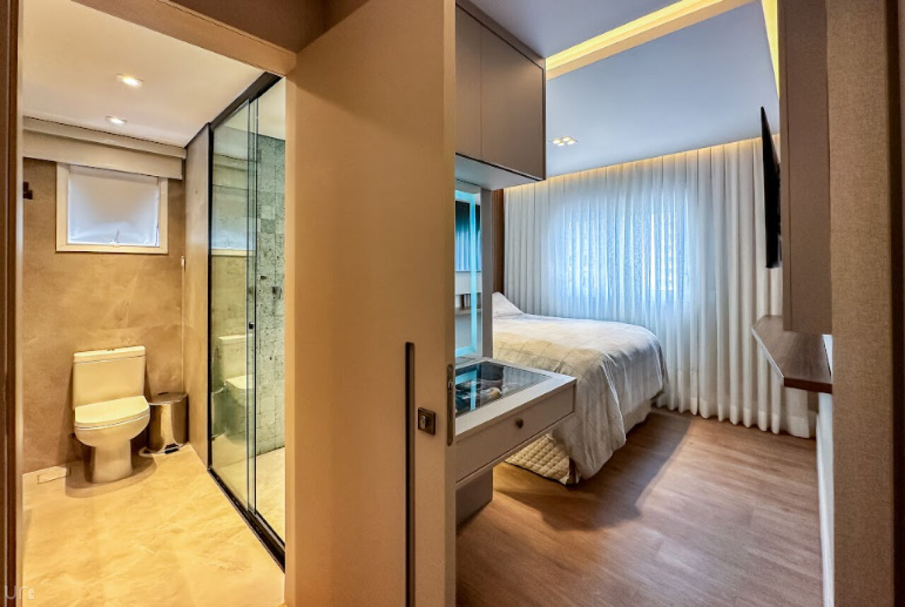 Os pisos porcelanato imitam madeira da Portinari e as suítes possuem chuveiro Acqua Plus Deca. A suíte principal oferece dois chuveiros, uma TV Samsung NeoQLED de 55 polegadas, cama queen, pia esculpida em pedra Silestone, louças Docol e o revestimento da área de banho é com uma linda pedra importada Hijau da Indonésia. Ambas as suítes são equipadas com ar condicionado Daikin.