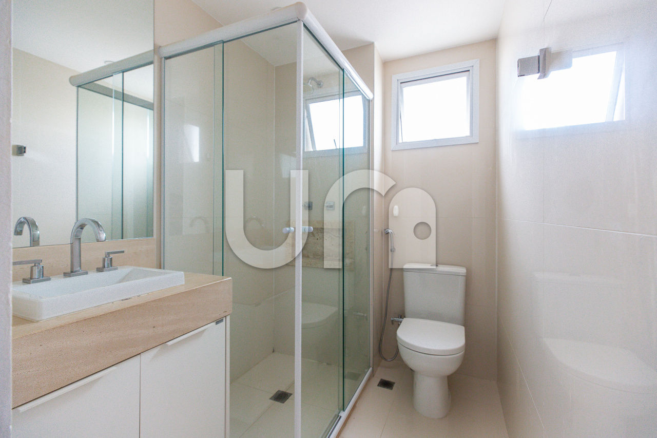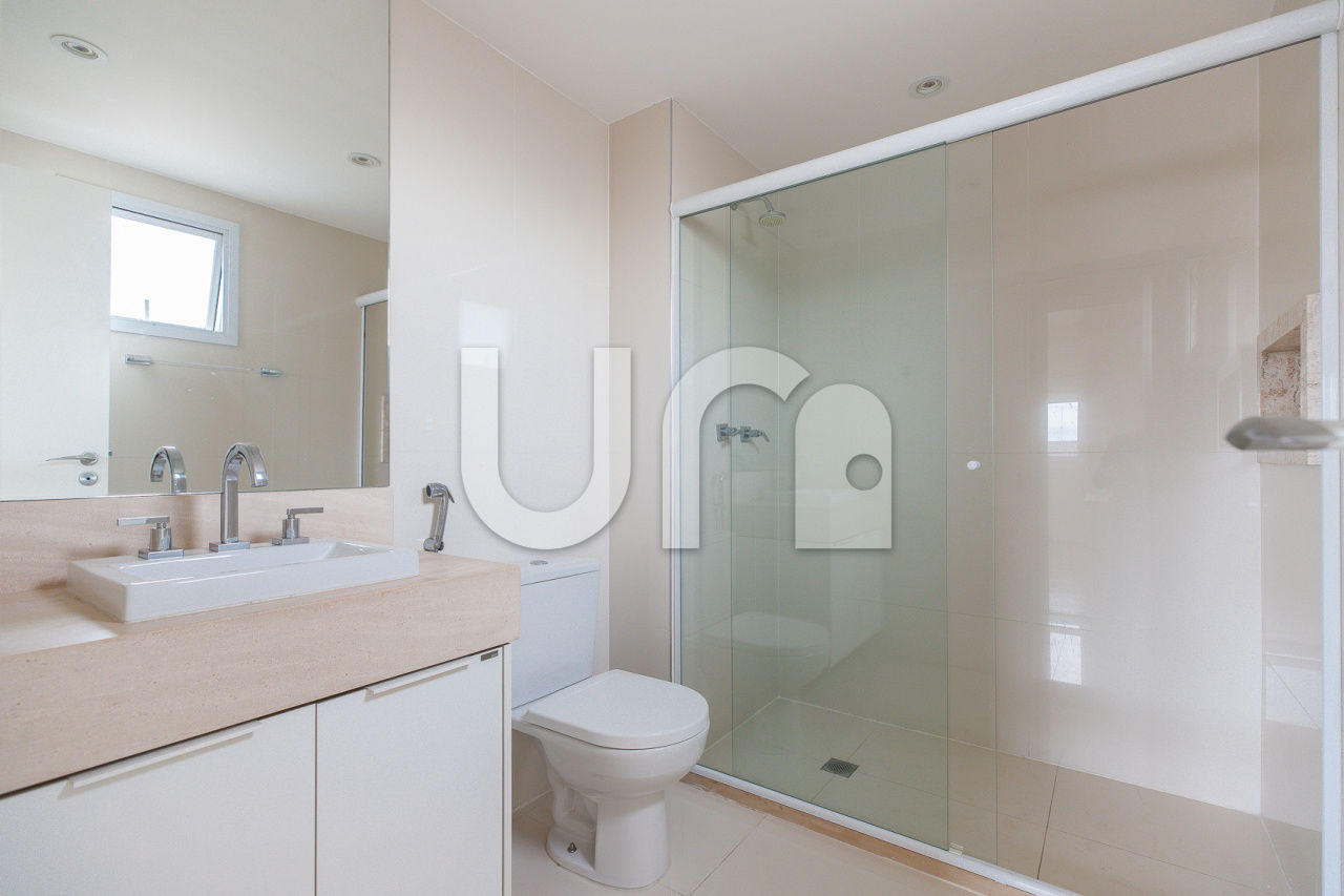 Banheiros em revestimento nobre, com detalhes em metais sofisticados. Conta com área de serviços para melhor atender as necessidades do dia a dia, duas vagas de garagem (as melhores do prédio) fixas (número do imóvel) e uma estrutura de lazer completíssima.